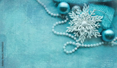 Christmas decoration with copy space. Elegant Happy New Year background. Christmas composition with neclace, toys, yarn.