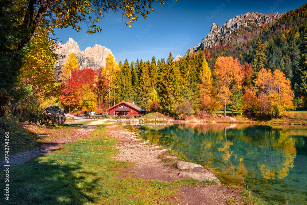 Superb autumn scene of Welsperg lake in the middle of the autumn forest. Calm morning view of Tonadico, Province of Trento, Italy, Europe. Nice landscape of Dolomite Alps. Travel the world.