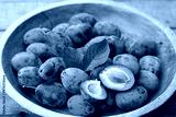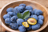 Frisch geerntete Ökologische Zwetschgen in einer Holzschale