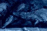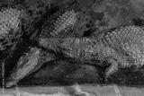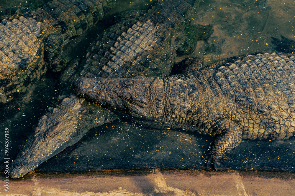 Top view of three crocodiles above water. One placing and resting his head on top of the other.