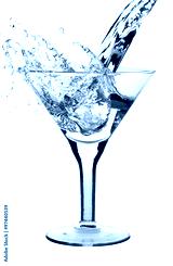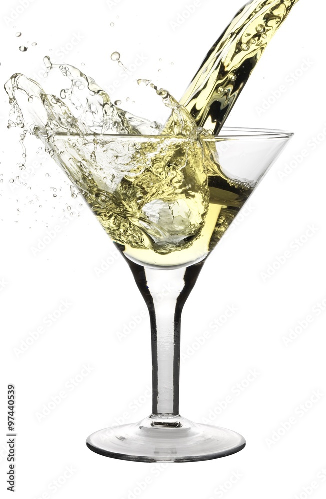Martini being poured in a martini glass; isolated on a white background.