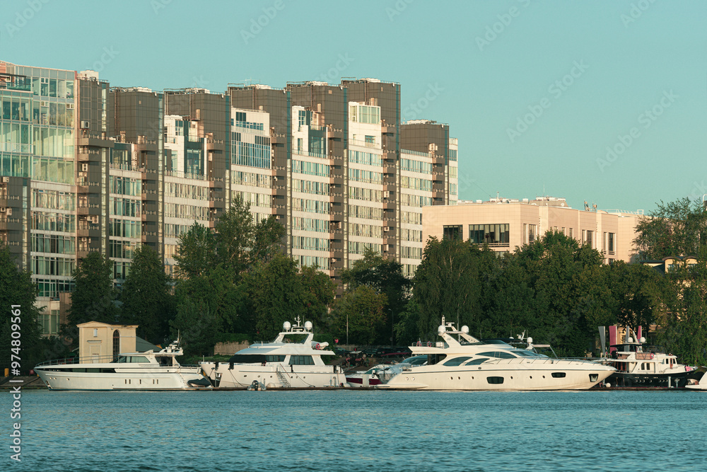 moored motor yachts in city marina