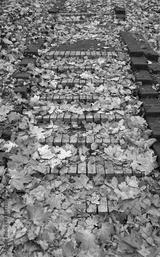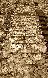 Autumn. Brick stairs on the park footpath, covered with yellow leaves. Pavement in old city Park with yellow maple leaves. Fallen leaves in old city park, background. Cloudy weather and fall season