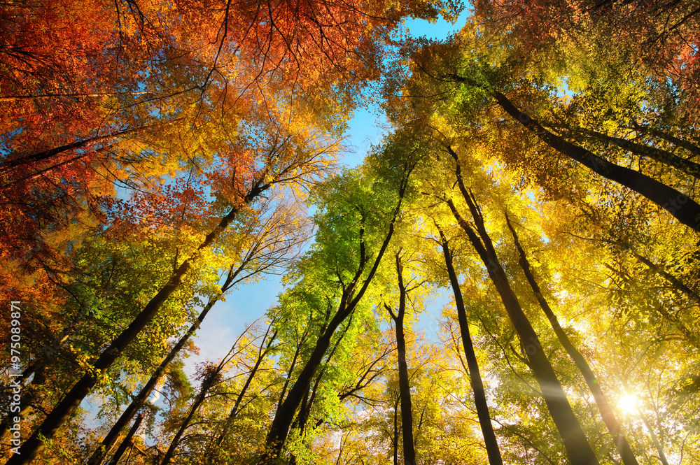 Autumn colors with a canopy of tall trees framing a stripe of blue sky, with the bright sun beautifully shining through the colorful foliage