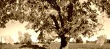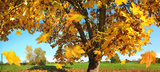 Sunlit maple tree against the blue sky on a nice autumn day, with yellow leaves falling to the ground in the wind