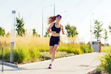 A woman runs along a path surrounded by tall grass under bright sunlight, exuding focus and energy.