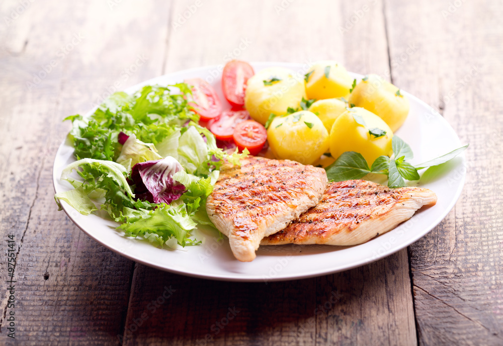 plate of grilled chicken breast with vegetables