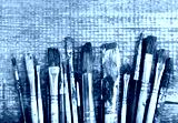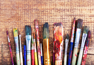 colorful paint brushes on a wooden table