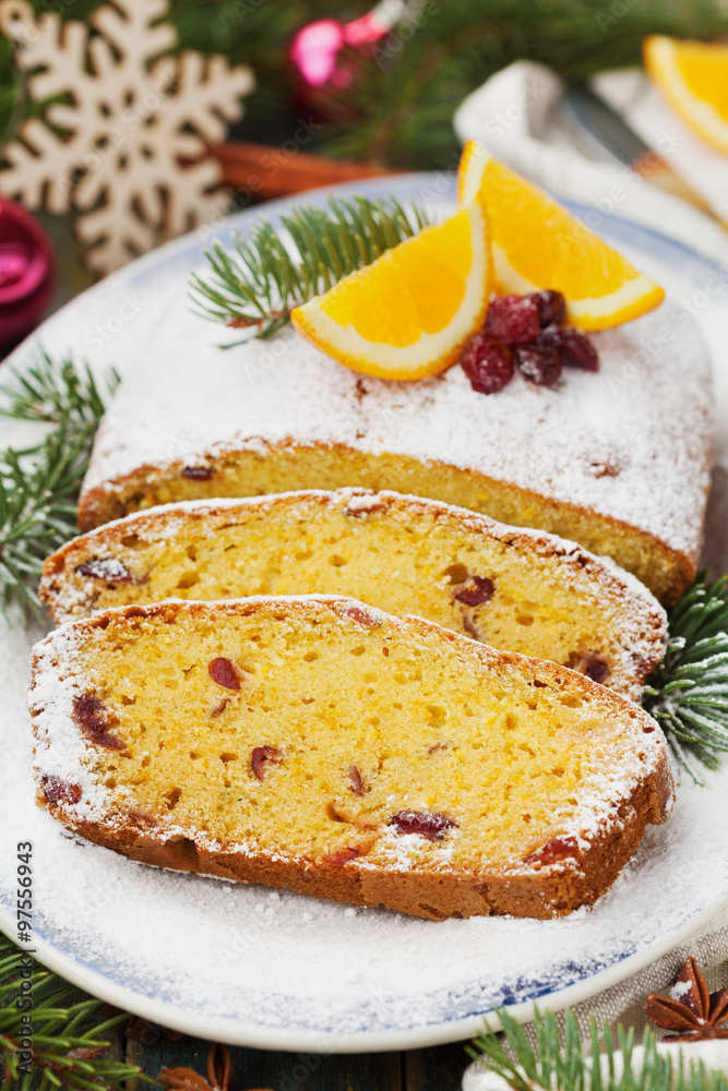 Traditional Christmas fruit cake with orange and dried cranberry decorated fir tree, icing sugar and Christmas toys