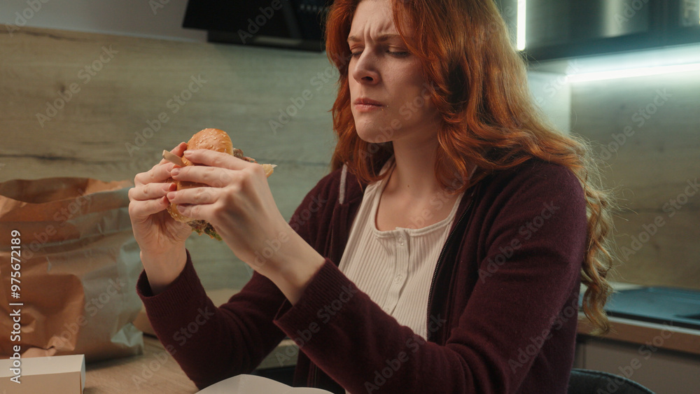 Unhappy displeased Caucasian woman hungry female girl upset lady client customer eating unappetizing cheeseburger chewing disgusting burger taste hamburger junk fast food quality order delivery indoor