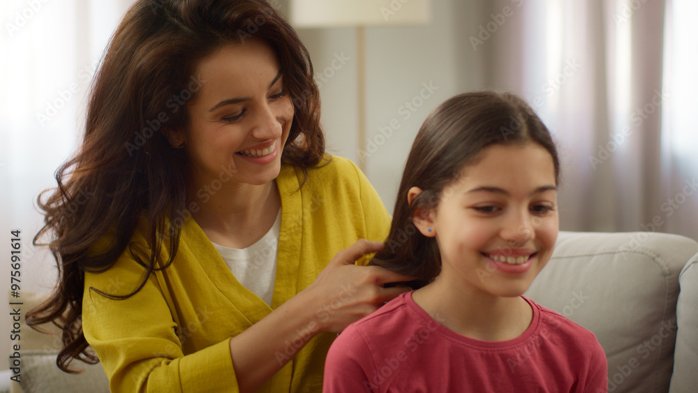 Caring loving Caucasian mother female woman sister braiding hair making hairstyle coiffure smiling little girl child kid daughter sibling talk chatting happy family time together indoor home apartment