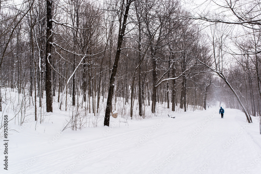 person walking alone in the Mont-royal park of Montreal under a snow storm in canada