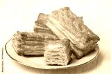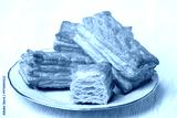 Delicious puff pastries in a white plate on a white wooden table. Puff pastry. Selective focus