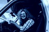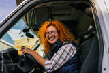 Happy ginger woman truck driver driving a truck.People and industrial transportation concept.