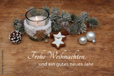Dekoration mit Kerze und Weihnachtsschmuck auf altem Holz mit dem Text Frohe Weihnachten und ein gutes neues Jahr.