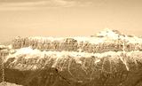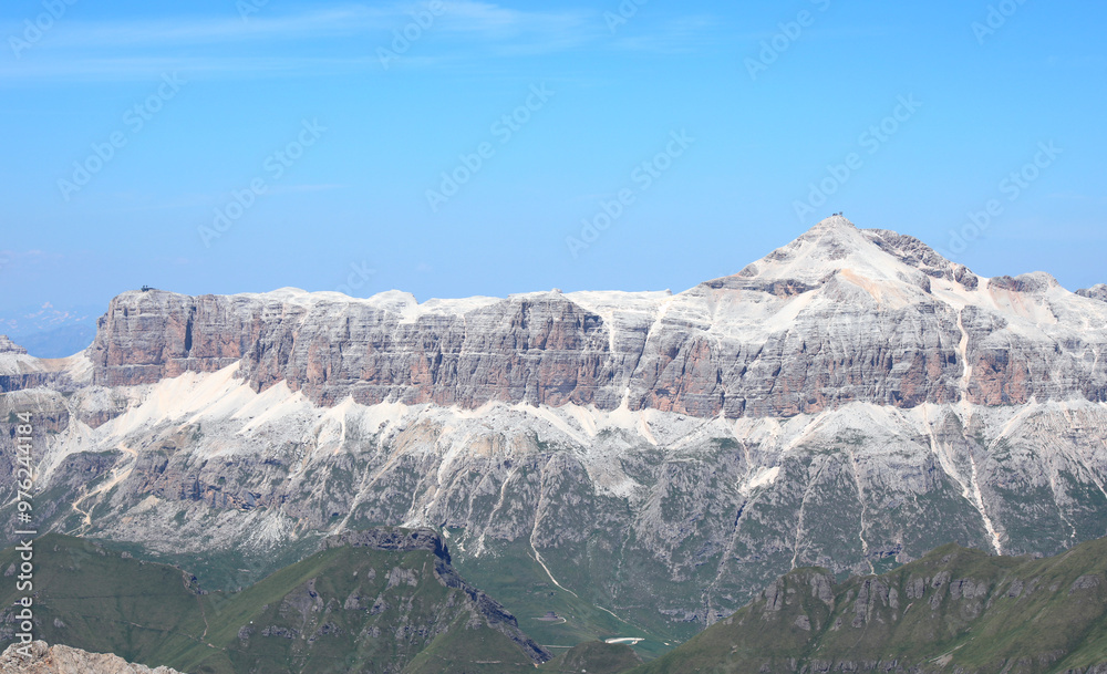 Pordoi Mountain and Peak of the Dolomites called Piz Boé where there is the alpine hut called CAPANNA Fassa at 3152 meters in the Alps of Italy