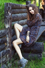 Outdoor fashion portrait of young beautiful woman. Boho chic sty