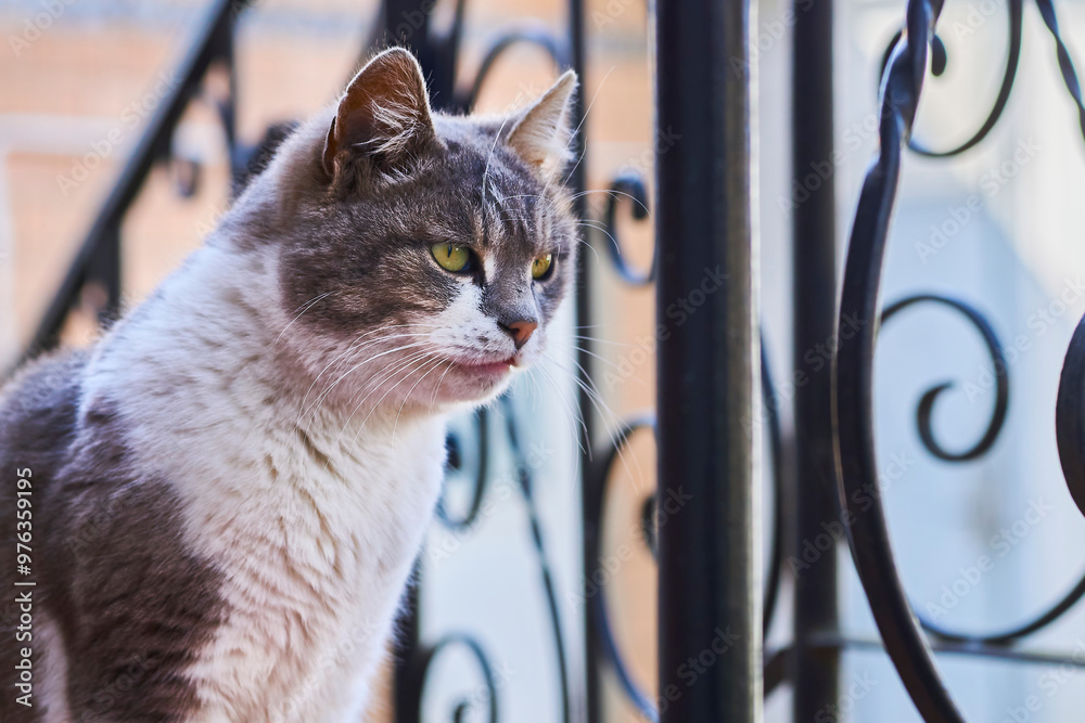 Serious gray cat. Protector of the house from mice and evil spirits. isolated