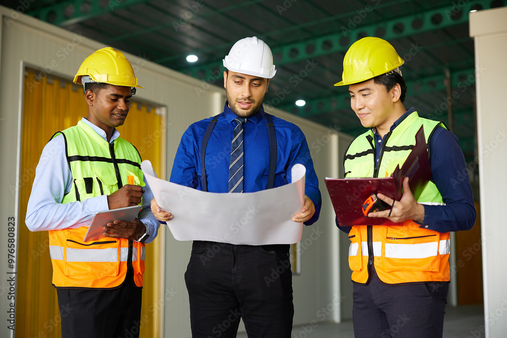 workers or engineers planning from work on blueprint drawing paper in the factory
