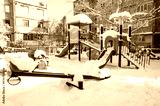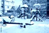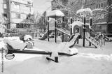 Playground with slide in park without children, covered with snow in winter season.