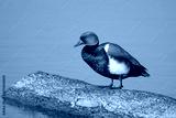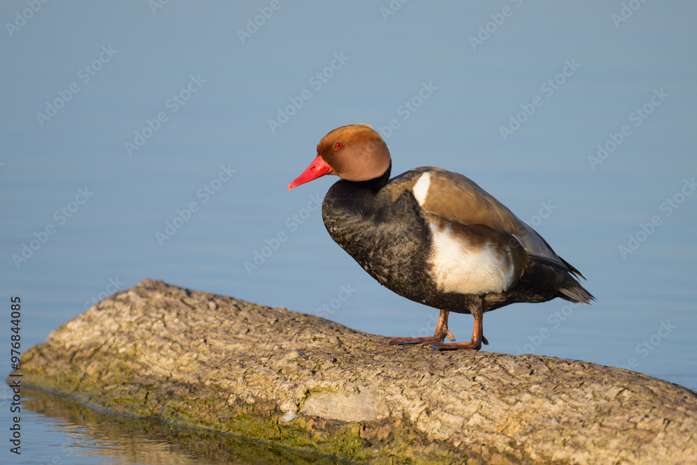 A male red crested Pochard standing on a piece of wood
