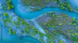 The aerial view with a ecosystem of the River lagoon Valley and blue water river