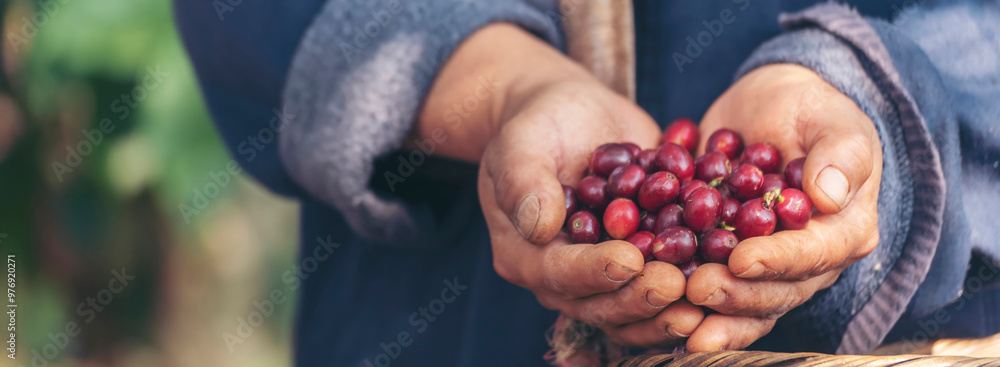 Banner hands harvest red seed in basket robusta arabica plant farm. Coffee plant farm Close up woman Hands harvest raw coffee beans. Ripe Red berry plant fresh seed coffee tree growth with copy space