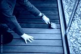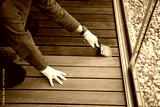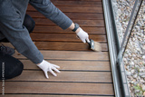 Worker refinishing wood, hand painting wooden deck floor with wood protection oil