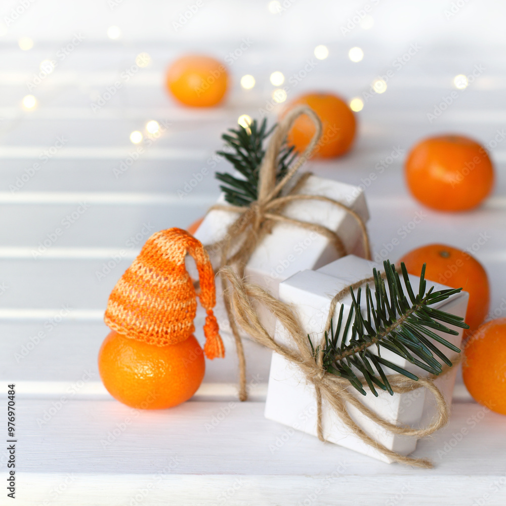gift decorated with a spruce branch and a tangerine in a cap. holiday surprises