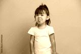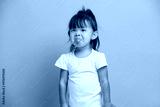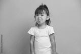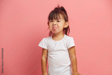 Little Asian baby girl shows tongue wears t shirt isolated over pink background. Three years old offended and capricious child.