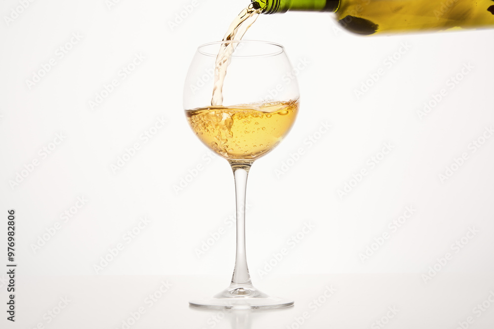White wine pouring from green bottle on white isolated.