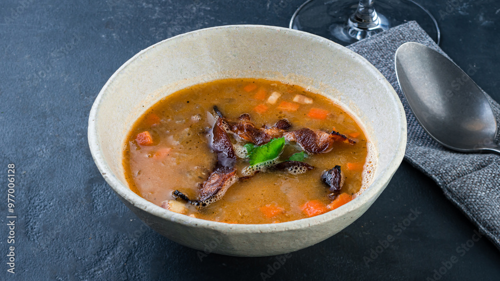 Hot soup with fried bacon, carrots, potatoes and onions.