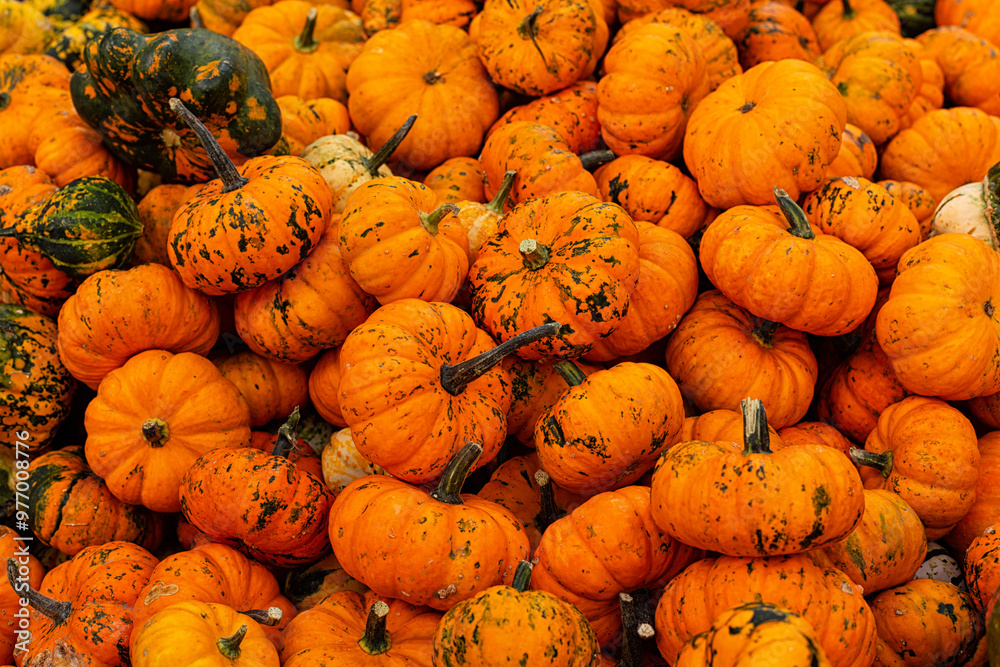 Baby pumpkins background, not ideal autumn farm vegetables.