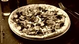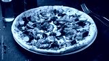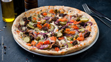Italian food pizza with mushrooms, pickled cucumbers, olives, tomatoes, onions, cheese and herbs.