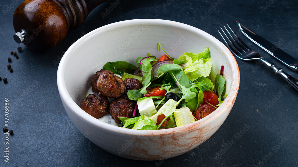 Fresh Greek salad of fresh cucumber, tomato, sweet pepper, lettuce, red onion, feta cheese and olives with fried meatballs.