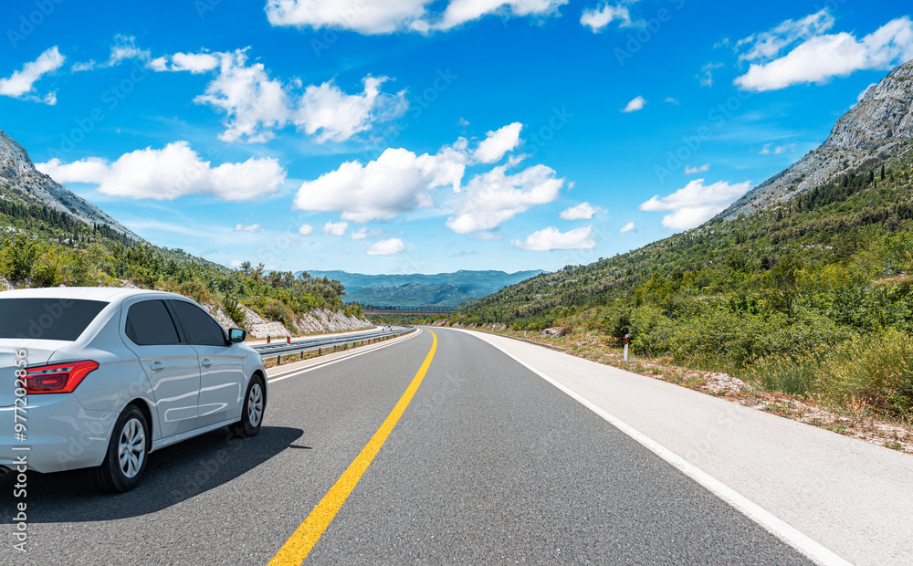 The car is driving along the highway surrounded by picturesque nature.