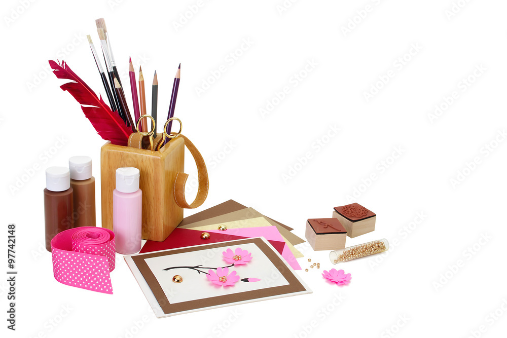 Handmade greeting card and assorted craft supplies. Pure white background, soft shadows.