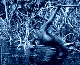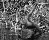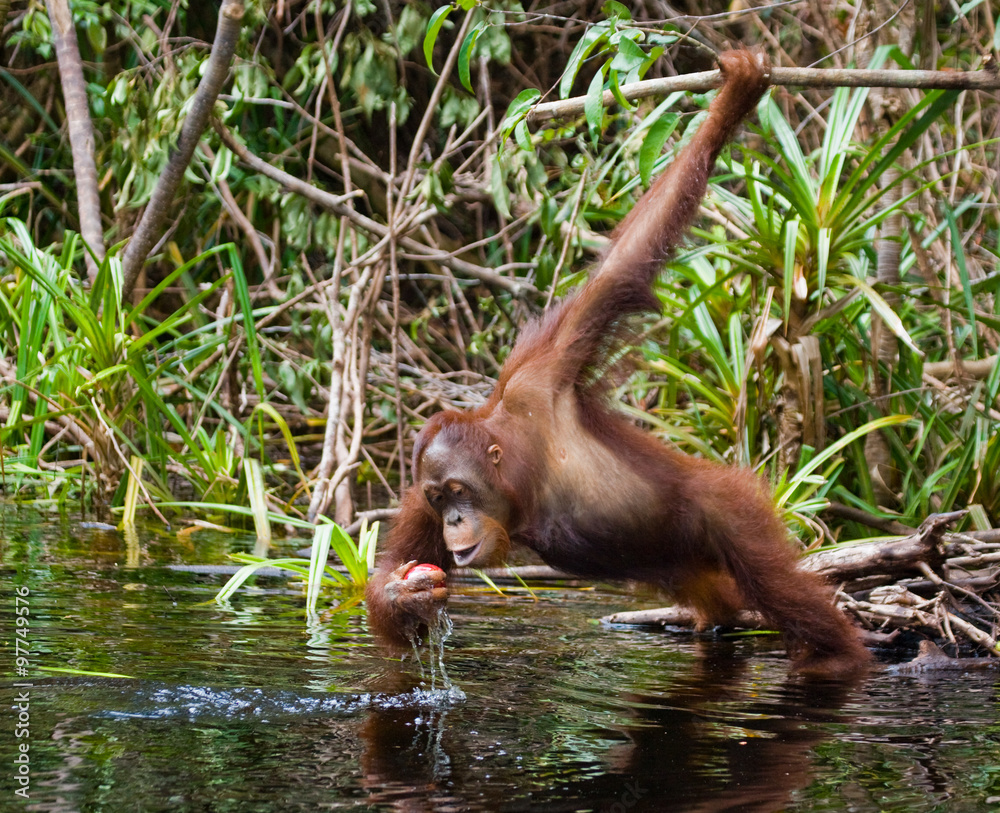 Orangutan drinking water from the river in the jungle. Indonesia. The island of Kalimantan (Borneo). An excellent illustration.