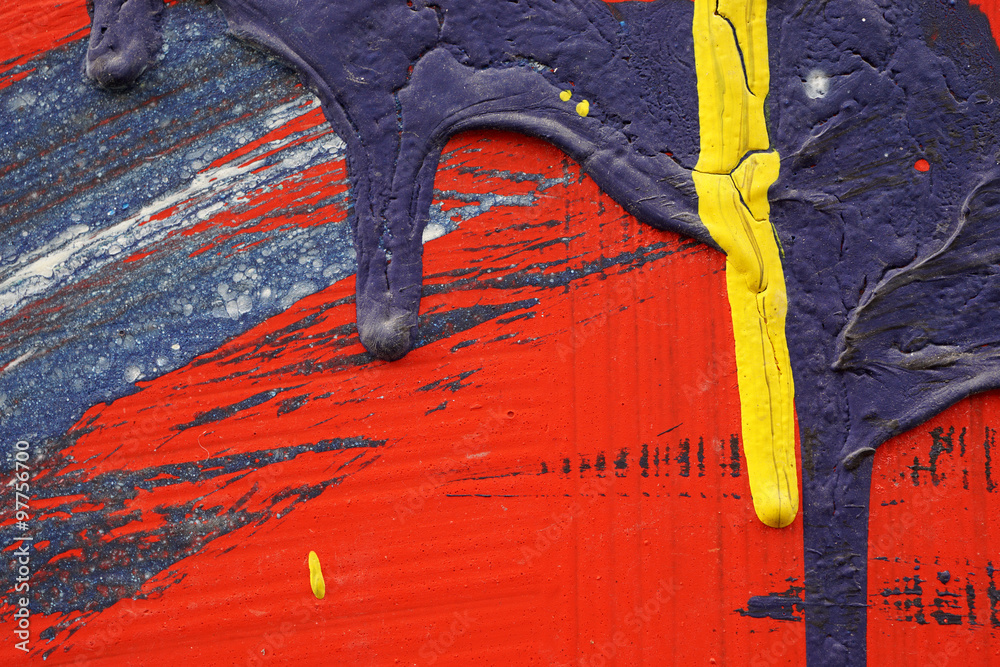 Yellow,black, blue and red acrylic paint on metal surface