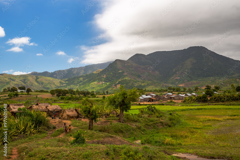 Typical Madagascar landscape - green and yellow rice terrace fields on small hills in region near Vohiposa along main road. green grass and bright ocher soil