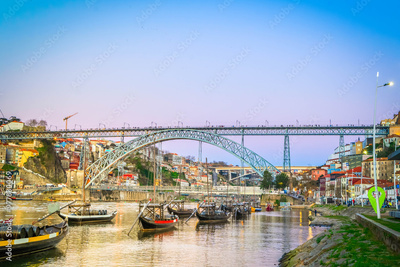 Picturesque, colorful view at old town Porto at sunset, Portugal with bridge Ponte Dom Luis over Douro river. Oporto, touristic mediterranean city