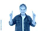 Cropped portrait of elderly woman lady with short grey hair in casual outfit t-shirt denim pointing showing upwards on copy empty space isolated in white background looking at camera.
