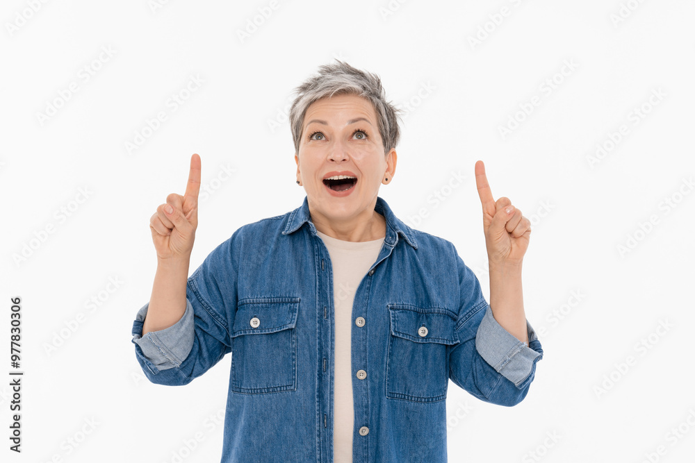 Amazed elderly mature woman in smart casual clothes white t-shirt denim grey hair pointing showing upwards on copy empty space isolated in white background looking up. People emotions concept