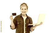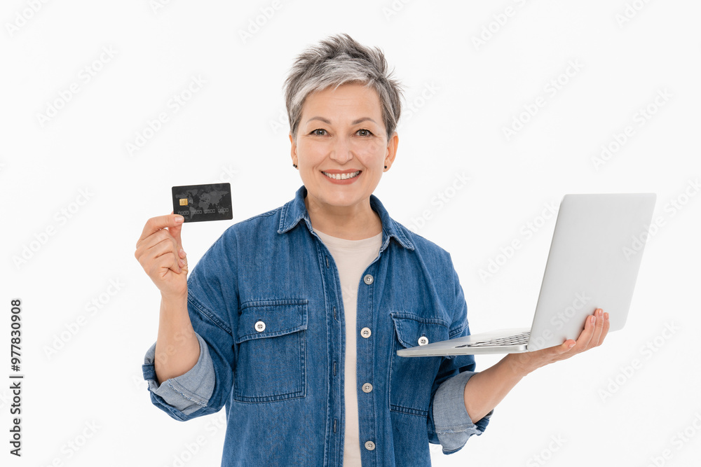 Smiling middle-age mature woman lady holding using laptop netbook computer pc demonstrate credit card e-commerce doing online shopping e-banking isolated on white color background