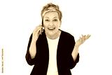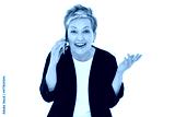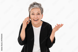 Mature middle-age smiling business woman in smart formal wear suit talking speaking communicating with partners colleagues heard great news express happy positive emotions isolated in white background