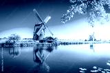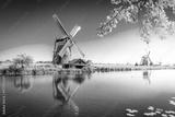 traditional dutch windmill with reflection at water, Kinderdijk at fall day, Netherland