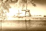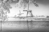 traditional dutch windmills with green grass and blue canal in Kinderdijk at bright fall day, Netherland