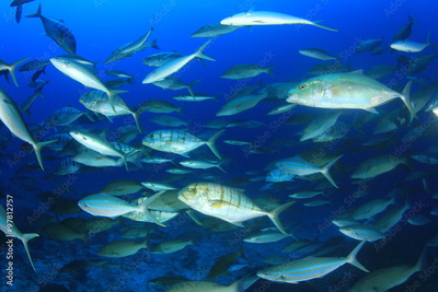 Pack of fish hunting: Tuna, Trevallies, Rainbow runners, Goatfish, Snappers