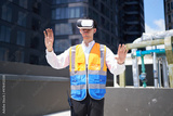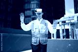 Engineer or worker wearing virtual reality glasses(VR) at urban industrial site