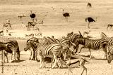 Telephoto shot of a herd of Burchell's Plains zebras -Equus quagga burchelli- standing uneasy and drinking from a waterhole in Etosha National Park, Namibia.